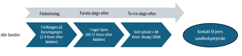 I vil blive anbefalet, at barnet får taget en blodprøve fra hælen (PKU) og får lavet en øjen- og hørescreening, når barnet er min. 48 timer gammelt. Samtidigt hermed vil jordemoderen eller sygeplejersken spørge kort ind til fødslen og sammen med jer vurdere, om der er behov for en uddybende efterfødselssamtale.
